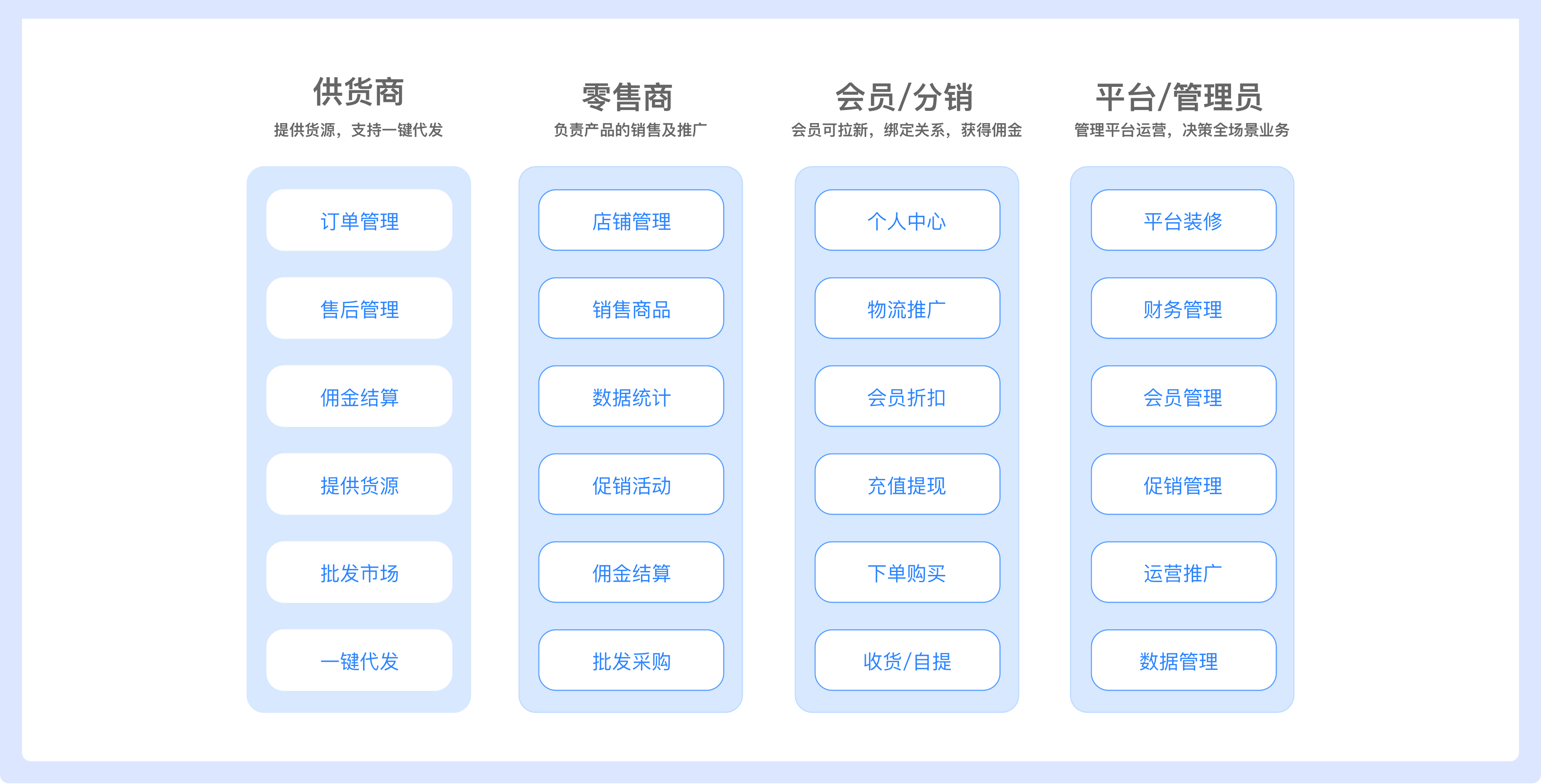 S2B2C系统支持供货商设置商品起批量、多级批发价格,零售商进行批发采购或一键铺货、一键代发商品到自己的店铺,同时支持零售商销售自己的商品